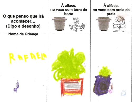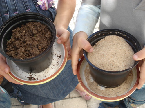 Arranjámos dois vasos iguais; num colocámos terra da horta e no outro colocámos a areia da praia que fomos buscar à nossa caixa coberta, que está no recreio.
