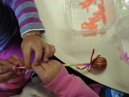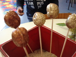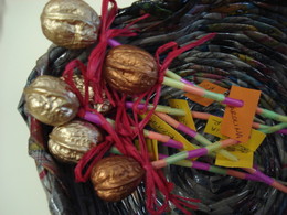 Fomos conhecer as nogueiras que estão perto da casa da Maria Eduarda e também pintámos de dourado as nozes que a Beatriz trouxe.